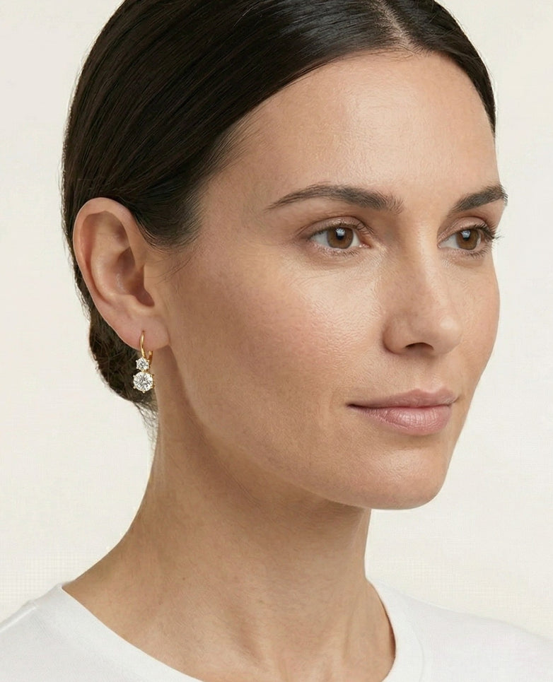 Visací náušnice ze 14K žlutého zlata kombinované se dvěma kubickými zirkony osazenými šesti krapnách.