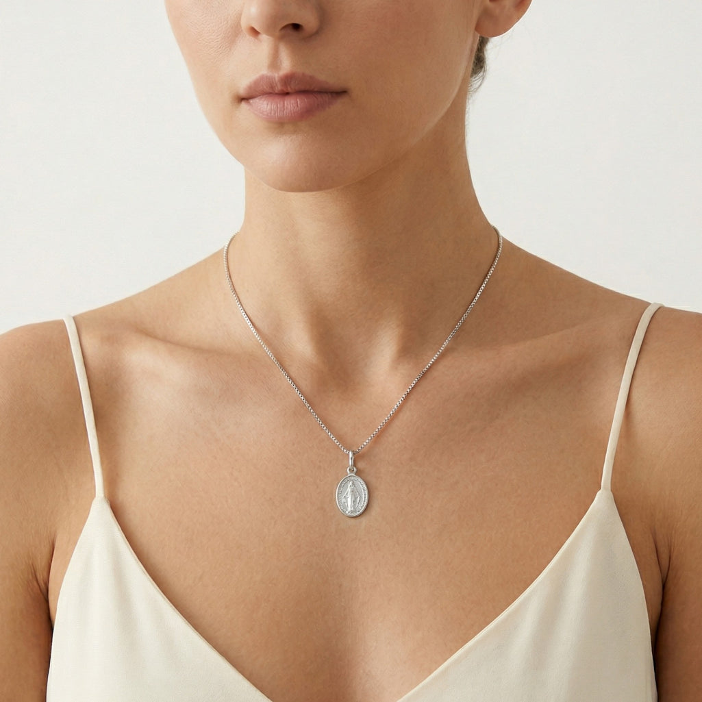 Stříbrný přívěsek s obrazem Panny Marie.