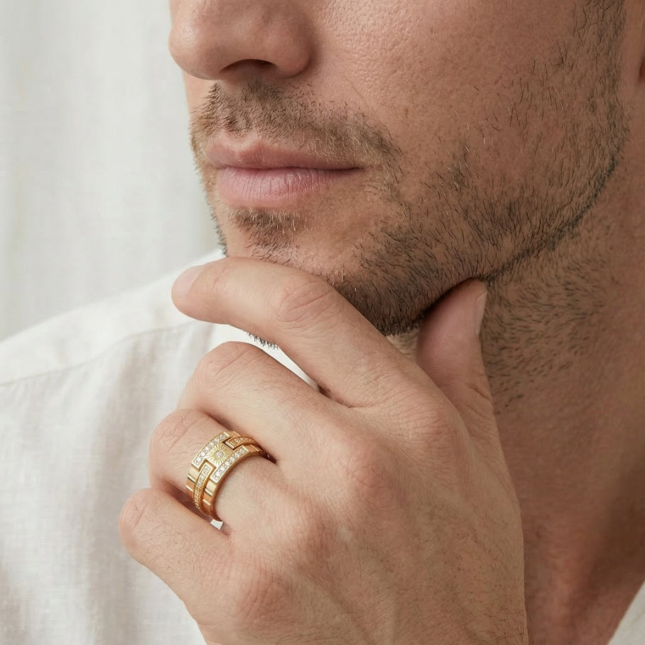 Stylový pánský prsten ze 14karátového žlutého a bílého zlata s jemně broušeným kulatým zirkonem - nadčasový šperk inspirovaný krásou pekla.