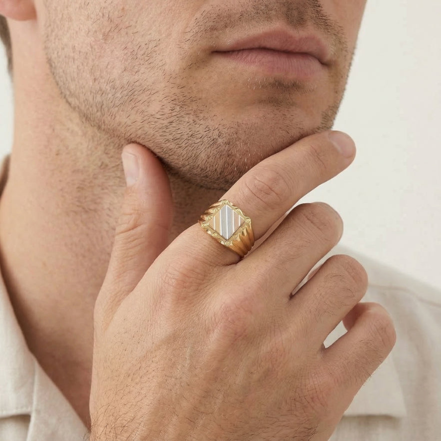 Pánský prsten z vysoce leštěného 14kt žlutého, bílého a růžového zlata je nadčasovým a univerzálním doplňkem.