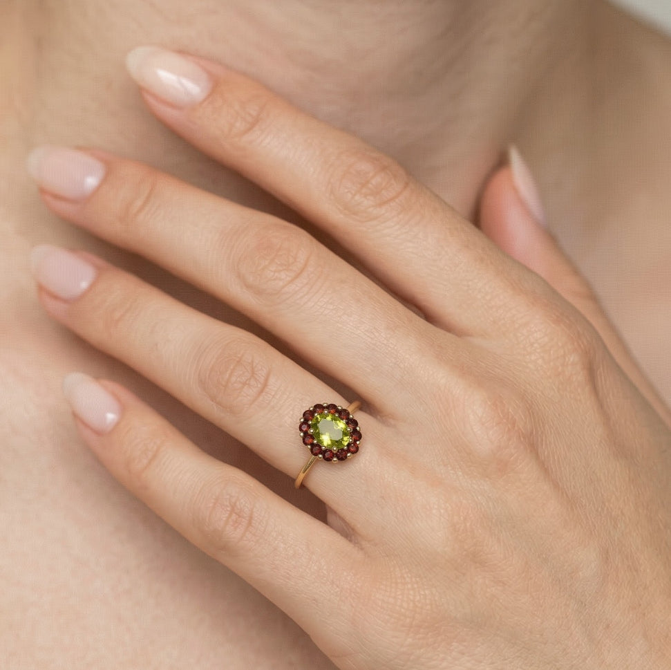 Objevte botanickou krásu těchto královských prstenů zdobených moldavitem v oválném jemném stupňovitém výbrusu a granátem v kulatém jemném stupňovitém výbrusu. Společné zasazení se zářezem ze 14kt žlutého zlata zajišťuje bezpečné a stylové uchycení. Pozvedněte svůj styl tímto nádherným prstenem inspirovaným květinami.