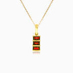 Přívěsek ze 14kt žlutého zlata se třemi granáty v podmanivém obdélníkovém zářivém výbrusu je moderní a elegantní. Tyčinkové zasazení dodá vašemu každodennímu stylu nádech sofistikovanosti.