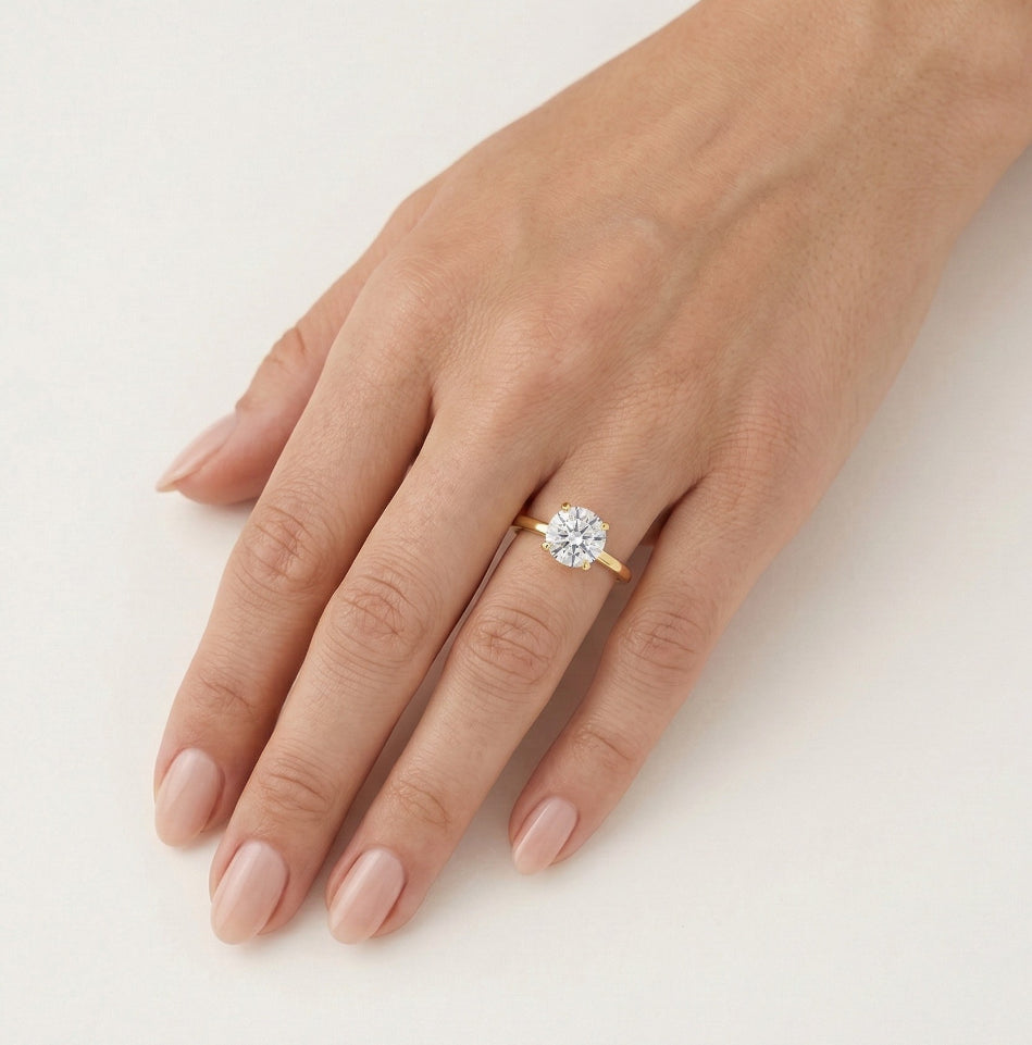 Klasický prsten ze 14K žlutého zlata s 8mm kubickou zirkonií osazenou čtyřmi krapnami.