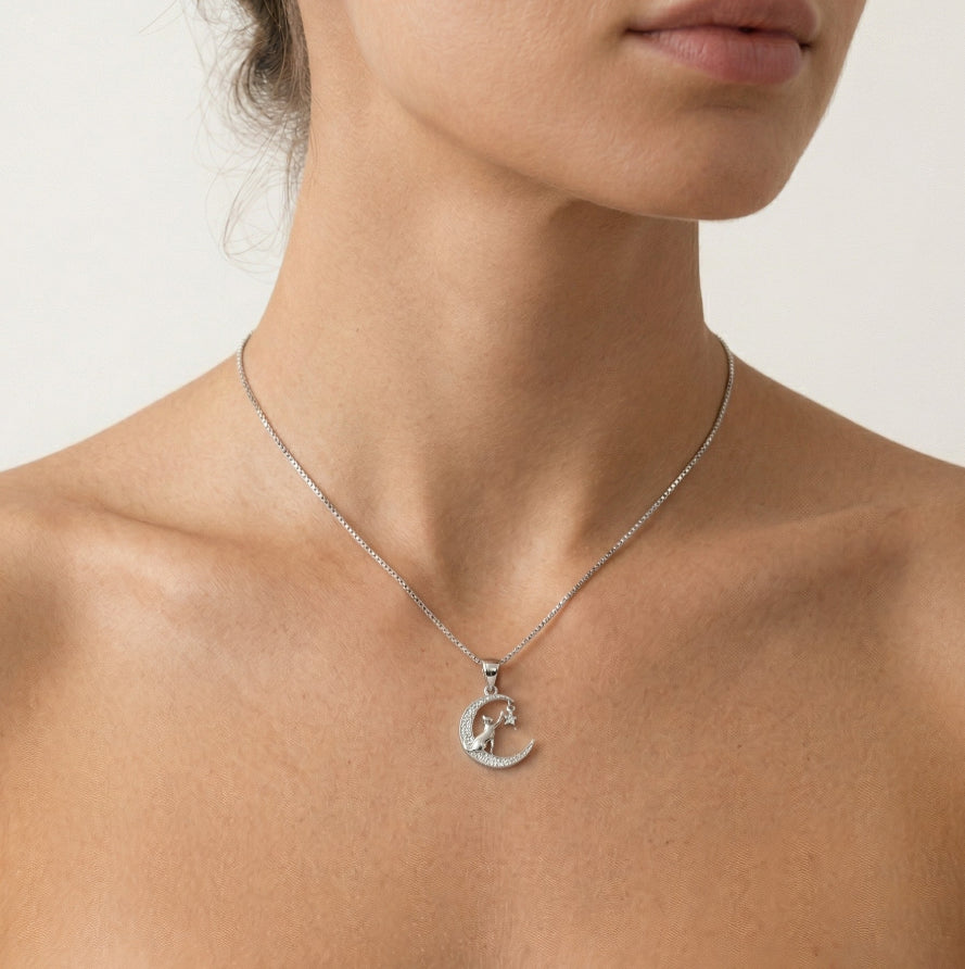 Kočka na měsíci je unikátní ručně vyrobený přívěsek ze sterlingového stříbra zdobený kubickou zirkonií ve tvaru měsíce a kočky, která si hraje s visící hvězdou.