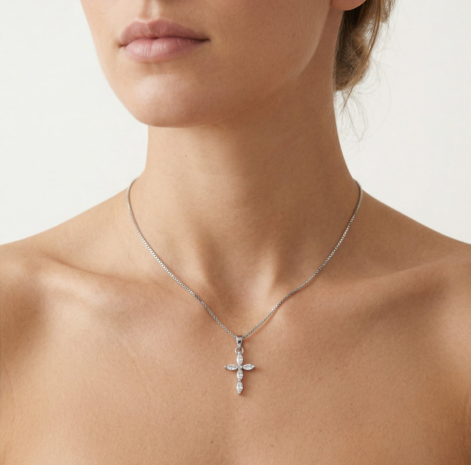 Markýza broušená bílá kubická zirkonie zasazená do stříbra ve tvaru kříže.
