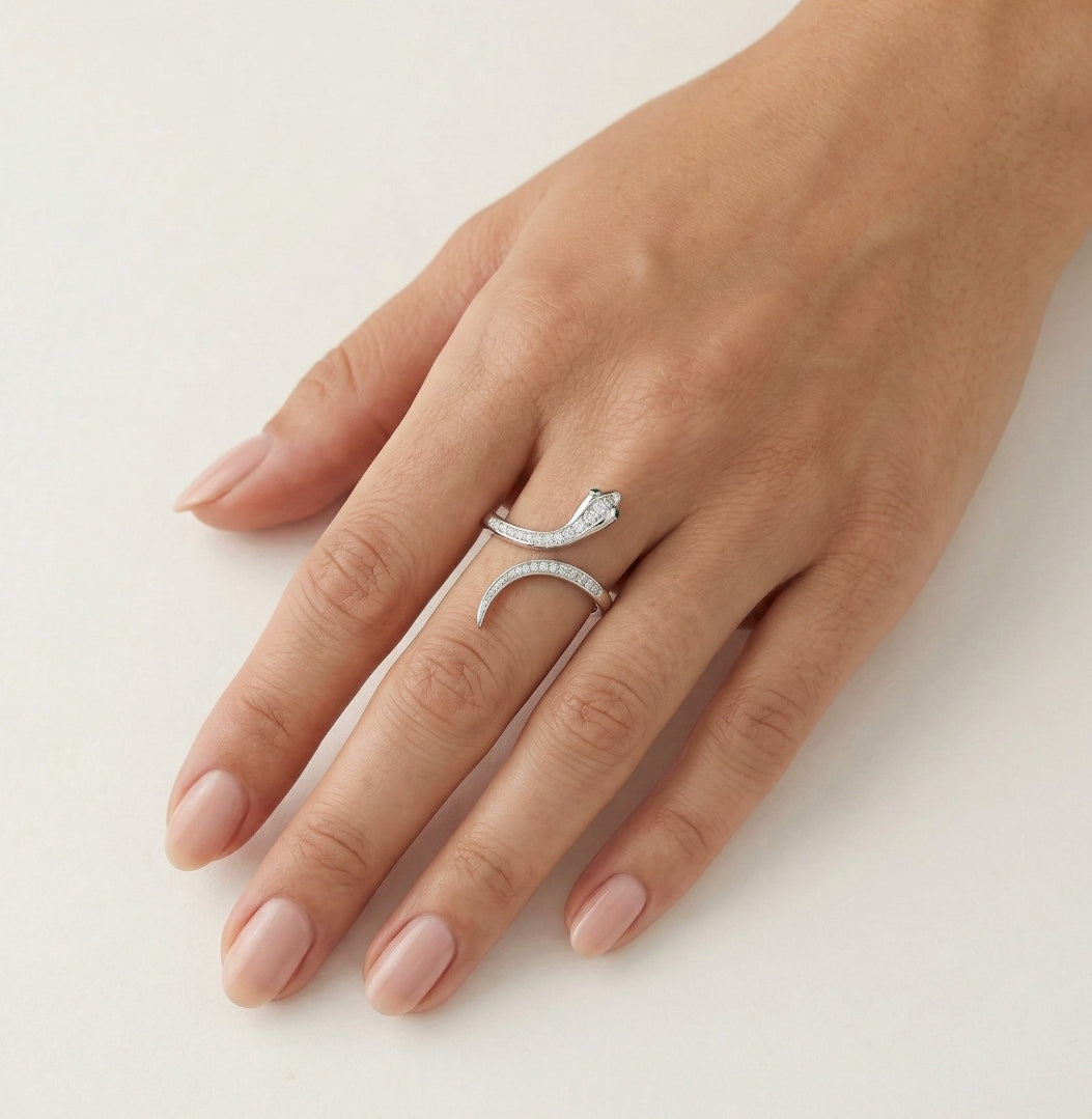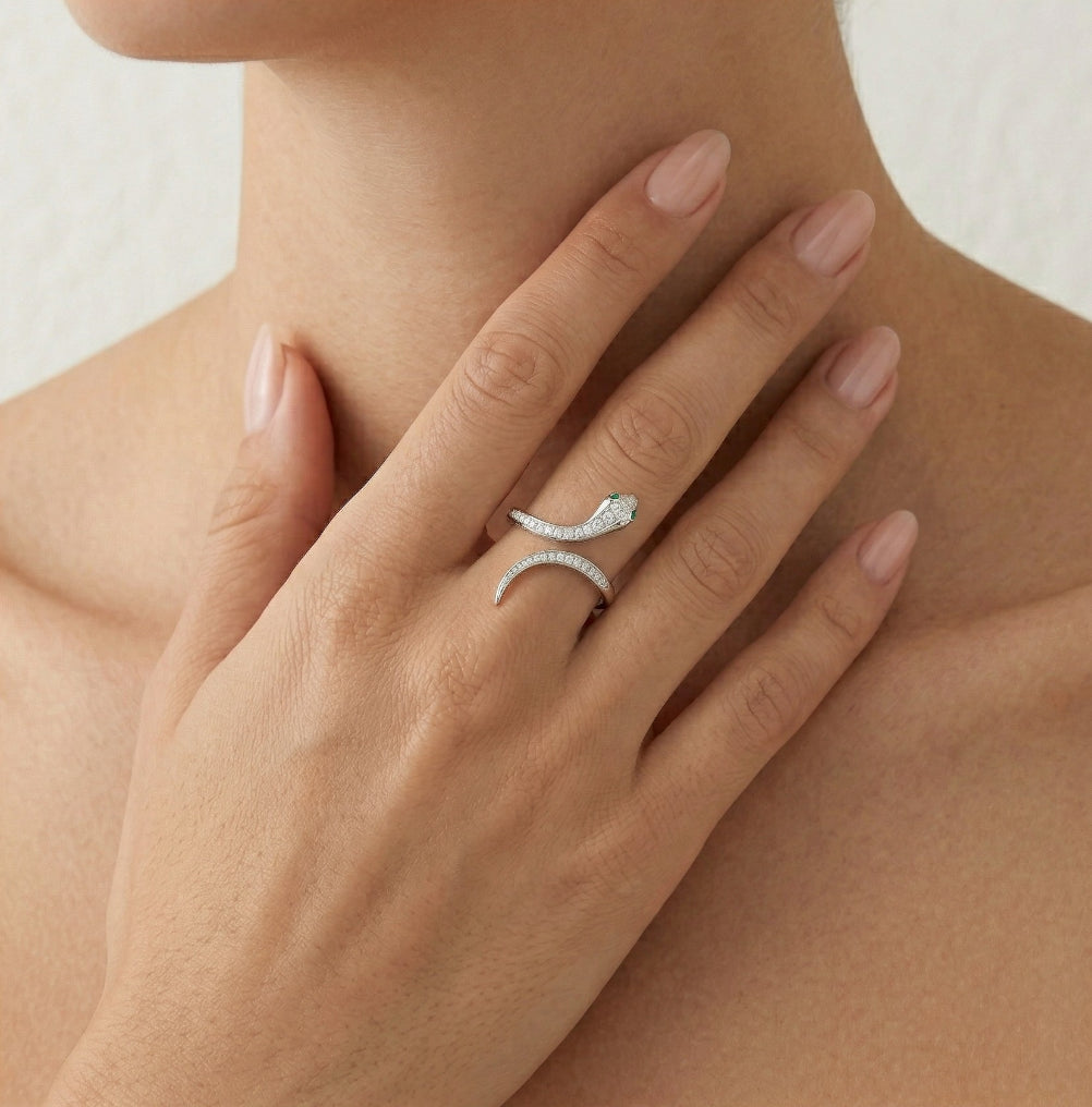 Vyzdvihněte svůj styl s tímto podmanivým dámským stříbrným prstenem s kubickými zirkony a syntetickými smaragdy v jemném stupňovitém výbrusu a se zářezem. Hadí design se zelenýma očima dodá každému vzhledu nádech mystiky.