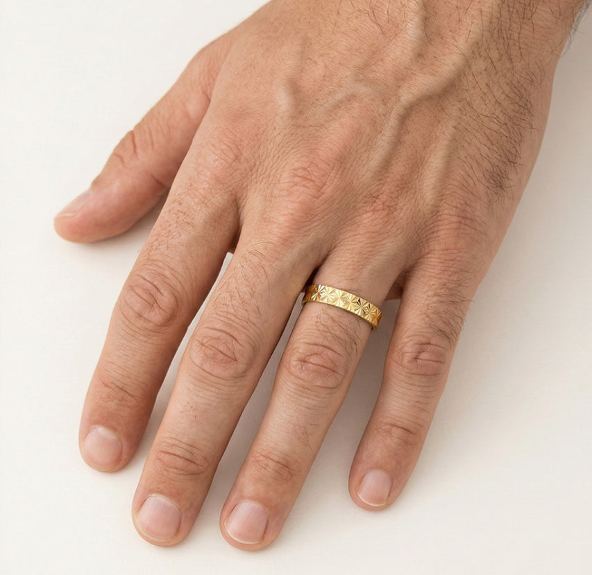 Tento elegantní snubní prsten pro muže a ženy je vyroben ze 14karátového žlutého zlata o tloušťce 3 mm. Základní kulatý tvar je obohacen o složité detailní linie, které vytvářejí nadčasový a sofistikovaný design. Tento prsten symbolizuje trvalou lásku a závazek díky svým klasickým, ale jedinečným vlastnostem.