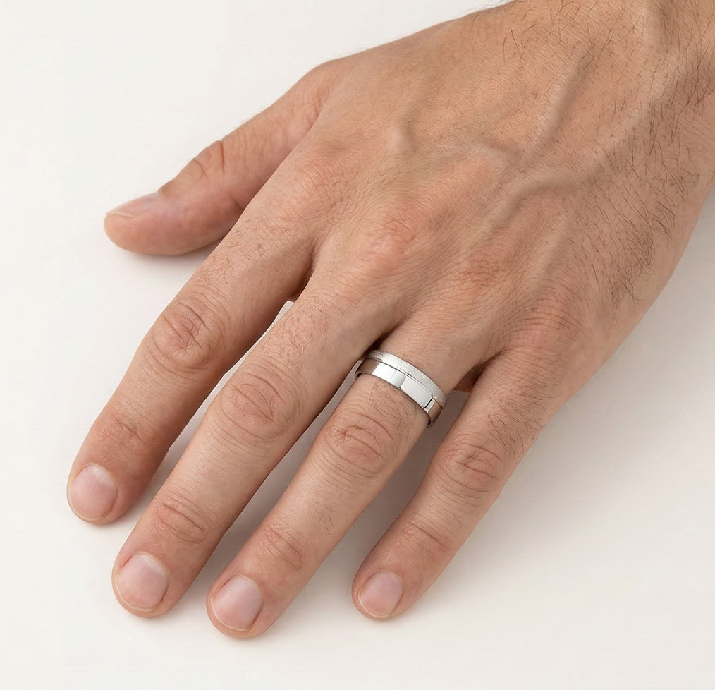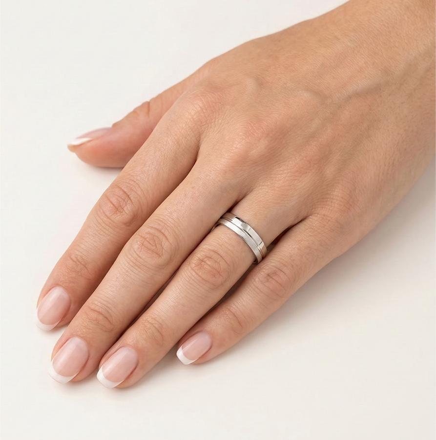 Objevte dokonalý snubní prsten pro ženy i muže, vyrobený ze 14karátového bílého zlata o tloušťce 5 mm. Tento jedinečný prsten má nápadnou napůl matnou a napůl leštěnou povrchovou úpravu, která vytváří úžasný kontrast symbolizující jednotu dvou různých stylů.