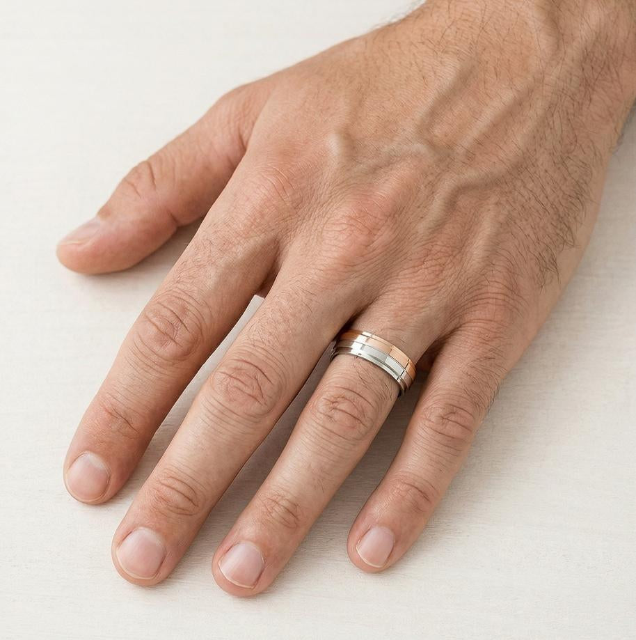 Tento 14kt snubní prsten krásně kombinuje bílé a růžové zlato v jedinečném designu půl na půl. Prsten o šířce 5mm je k dispozici v hladkém provedení nebo s kubickým zirkonem či 0,02ct diamantem v zasazení s kulatým jemným stupňovitým výbrusem. Úžasná volba pro ženy i muže, která nabízí moderní pojetí klasické elegance.