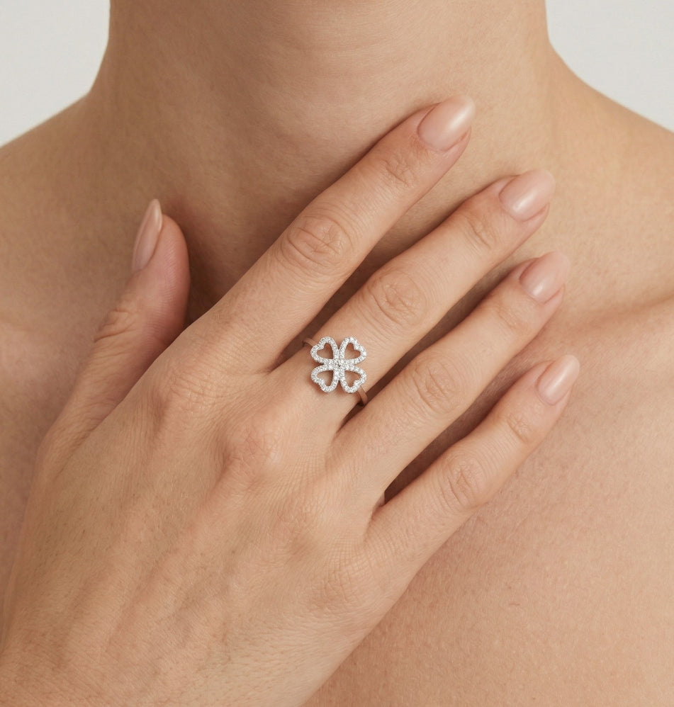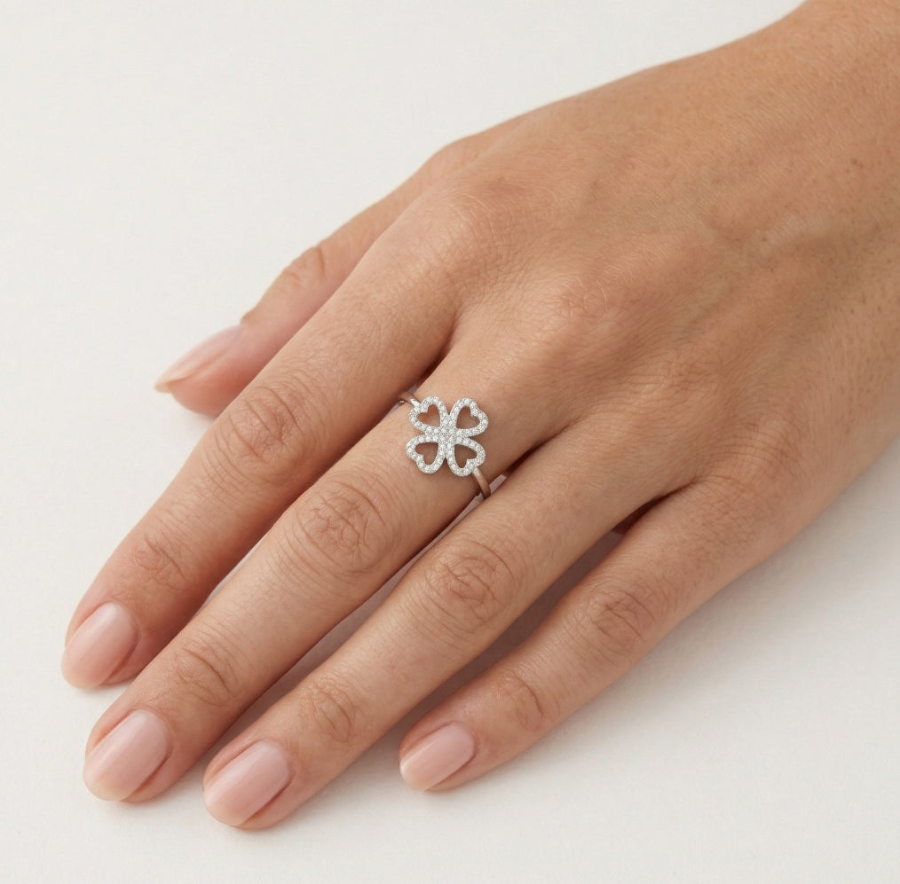 Dámský stříbrný prsten s okouzlujícím vzorem čtyřlístku zvýrazněným třpytivými kubickými zirkony v kulatém jemném stupňovitém výbrusu. Tento elegantní šperk, vyrobený s bezpečným zasazením, symbolizuje štěstí a dodá každému outfitu nádech sofistikovanosti.