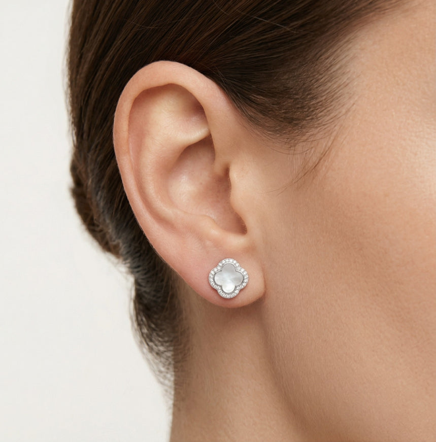 Dámské stříbrné náušnice s jemným vzorem čtyřlístku zdobeného plochou perletí a třpytivou svatozáří z kulatých jemných zirkonů s krokovým výbrusem. Osazení hroty umocňuje lesk a bezpečné zapínání puzetami dělá z těchto náušnic sofistikovaný a nadčasový šperk pro každou příležitost.