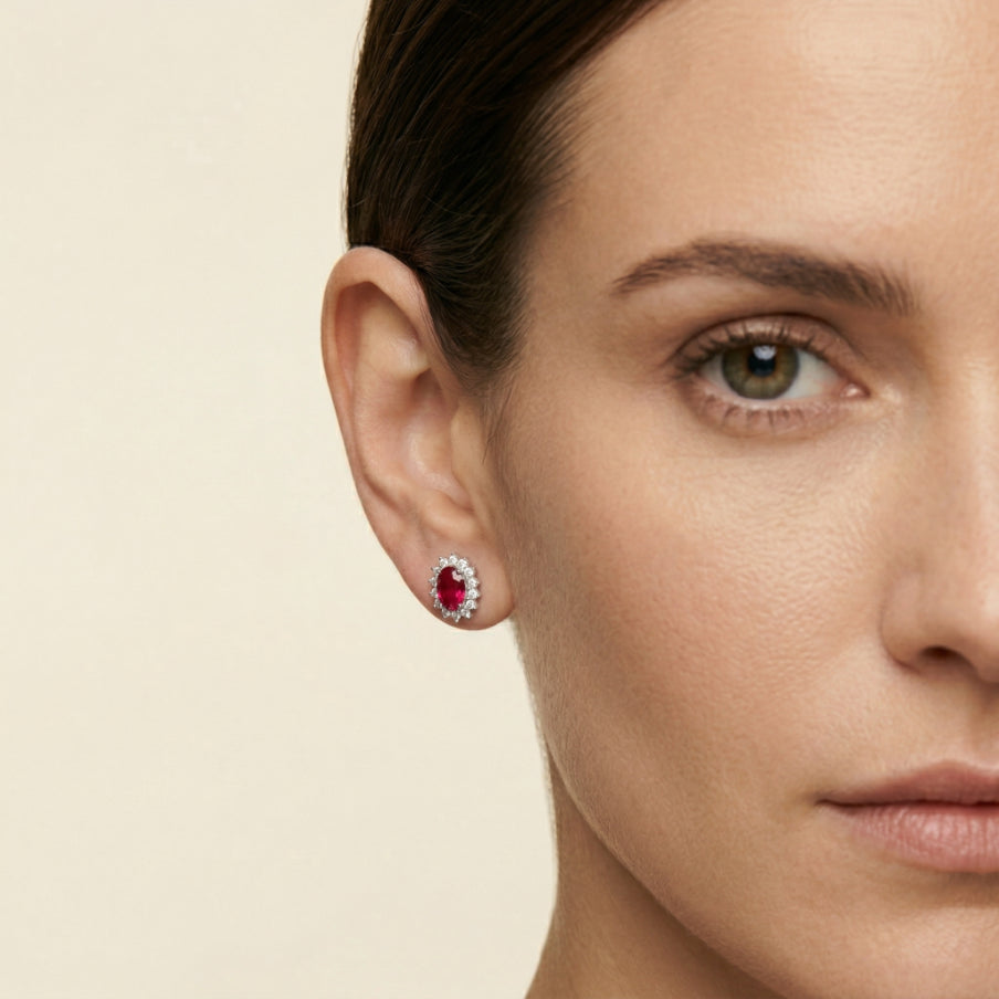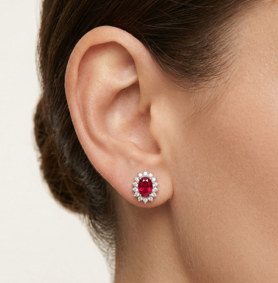 Dámské stříbrné náušnice ve tvaru svatozáře s oválným syntetickým rubínem v oválném jemném stupňovitém výbrusu, který obklopují třpytivé kubické zirkony v kulatém jemném stupňovitém výbrusu. Tyto náušnice, navržené s bezpečným puzetovým zapínáním a zasazené v odolných afroháčcích, dodají nadčasový půvab každému kompletu.