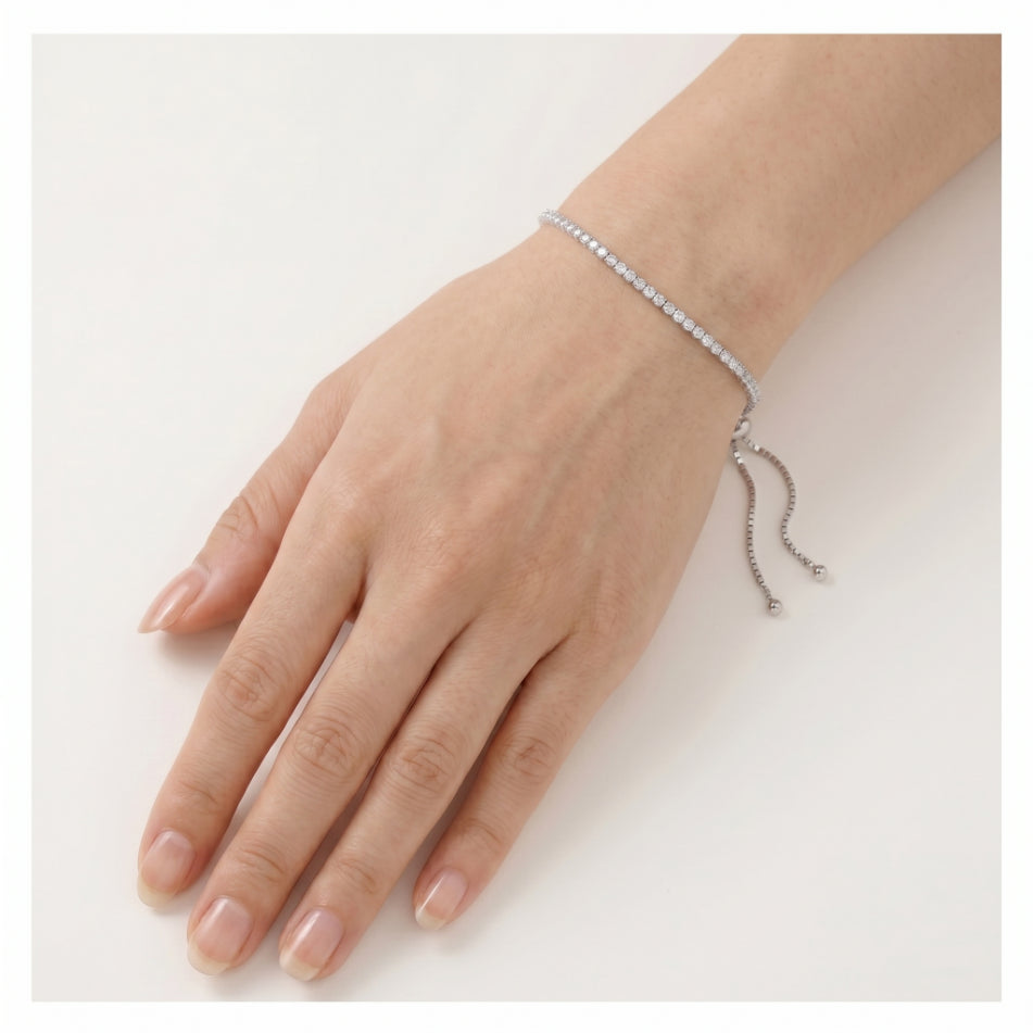 Ponořte se do elegance s naším stříbrným tenisovým náramkem, který je zdobený třpytivými kubickými zirkony s kulatým jemným stupňovitým výbrusem. Zajištěn je zasazením s kolíčky a klapkami pro eleganci a pohodlí.