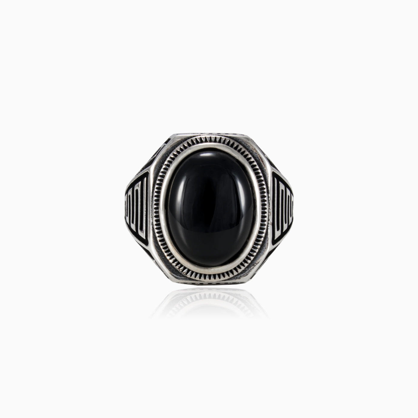 A bold sterling silver men ring featuring an oval onyx framed in a smooth bezel that enhances its deep and refined appearance. The solitaire design delivers a strong and timeless presence, perfect for a striking everyday statement.