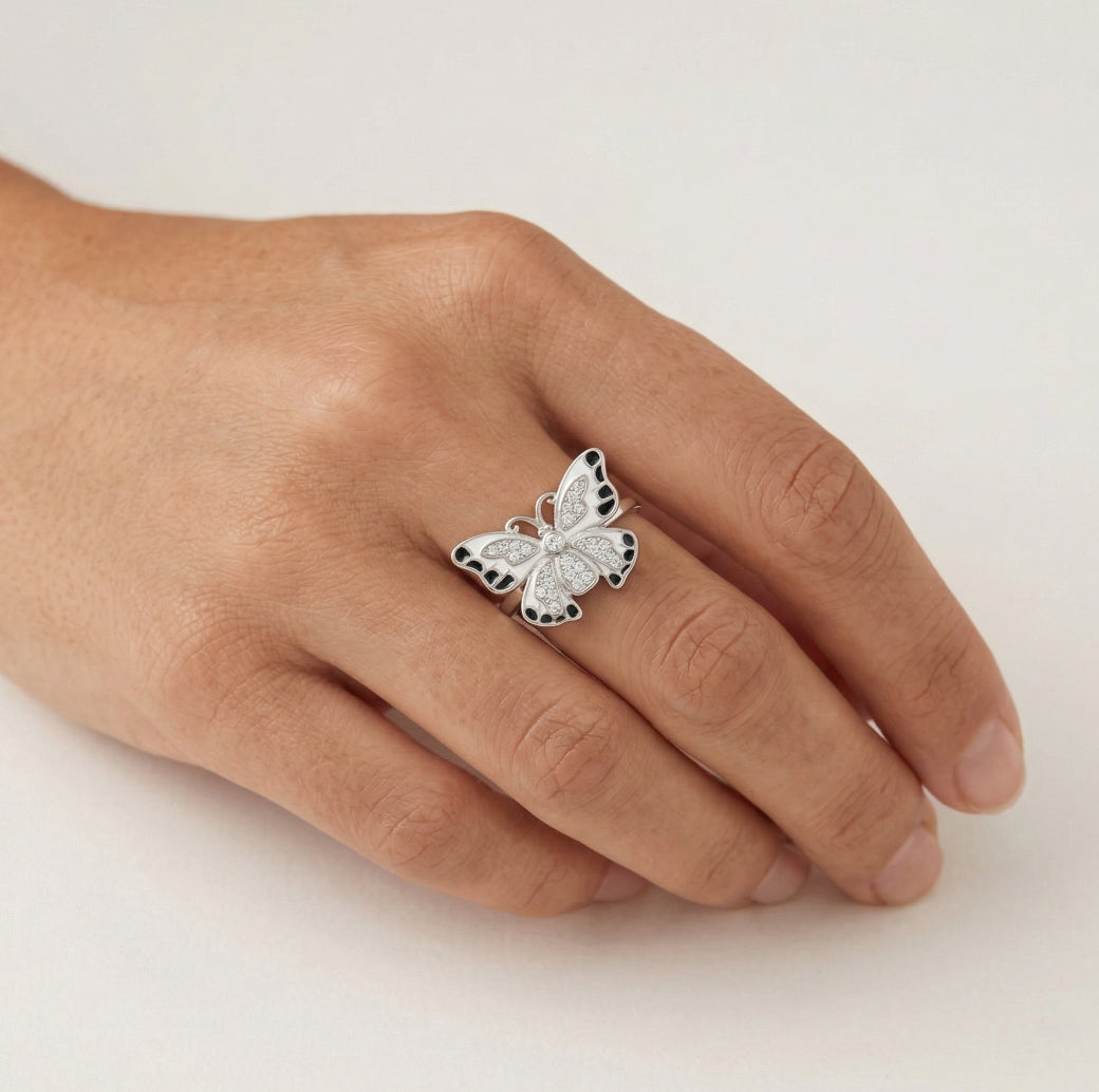 Women’s sterling silver ring with a delicate butterfly design. Features black and white enamel details in a prong setting, creating a unique and whimsical accessory. Perfect for adding a touch of nature-inspired charm to any outfit.