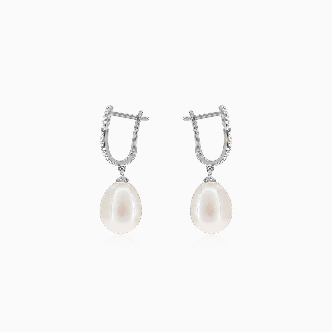 These exquisite dangling earrings capture the harmony of elegance and grace. Crafted from 14kt white gold with round diamonds VS1 G 0.08ct in a channel setting and luminous pear shaped pearls delicately drilled for balance they radiate sophistication and refined beauty. The secure latch back closure ensures comfort while their timeless design celebrates luxury and feminine charm.
