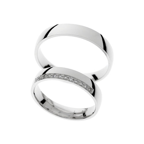 This 14kt high polished white gold wedding ring embodies timeless elegance with its classic design. The 4mm band offers a sleek and sophisticated look, available either plain or adorned with a 0.09ct round fine step-cut diamond. Ideal for both women and men, it’s a perfect symbol of enduring love.
