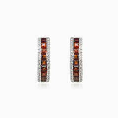 Stunning 14K yellow gold earrings with channel-set princess-cut natural garnets surrounded by brilliant-cut round diamonds on each side.