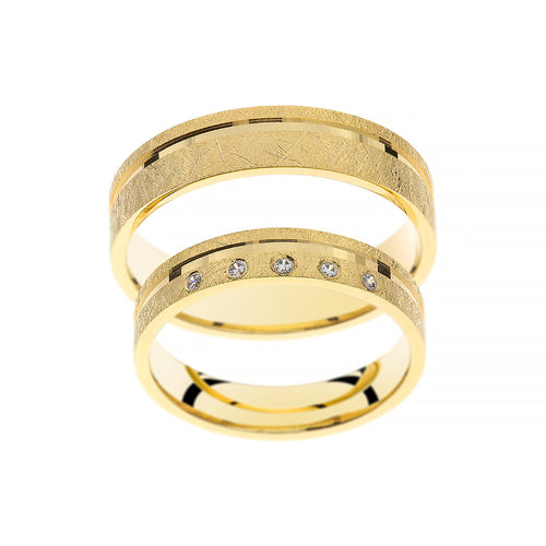 This 14kt yellow gold wedding ring flat channel around its available in a plain band in 5mm thickness or with a 0.05ct cubic zirconia or diamond in a bezel setting with 4mm thickness, the ring features a round fine step-cut. Perfect for women and men who desire a substantial and sophisticated symbol of their commitment.