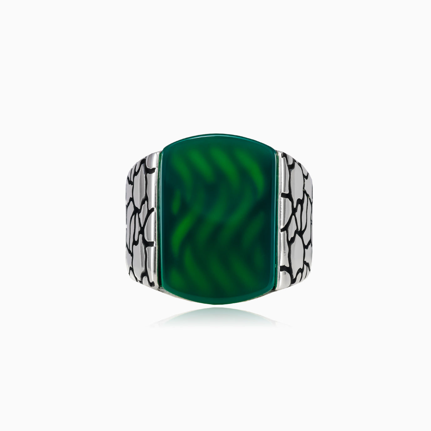This sterling silver men ring showcases a vibrant radiant cut jade that stands out with its structured shape and bold character. The bezel finish enhances the stone while the strong silhouette adds a confident and refined touch.