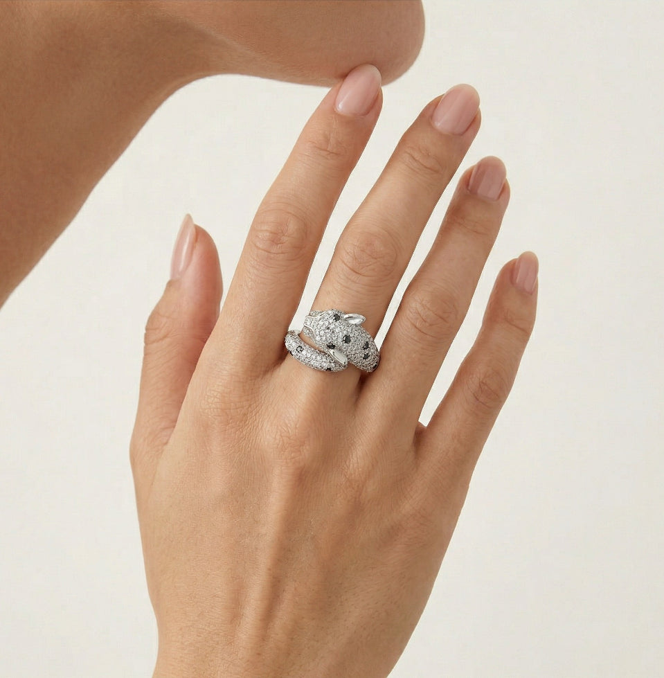 Dive into enchantment with this panther-themed women's ring crafted in 14kt white gold. Featuring a captivating dolphin motif, it showcases a stunning round fine step-cut diamond paired with a brilliant blue sapphire, both elegantly set in a prong setting.
