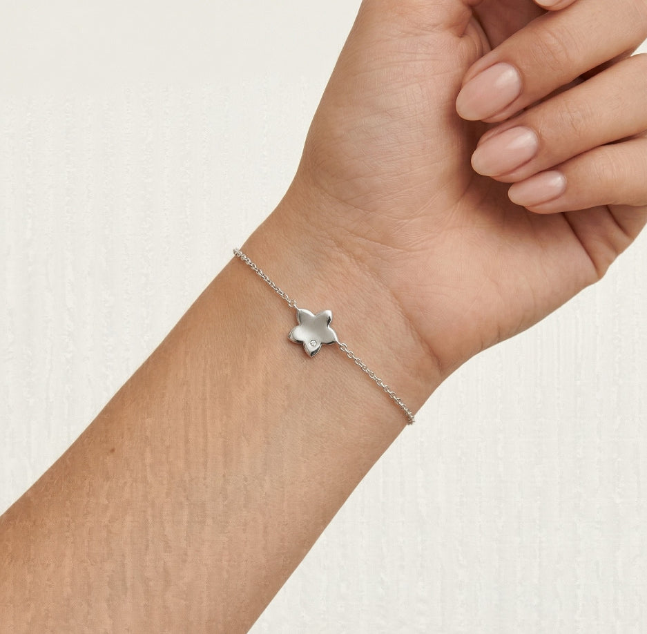 Beautiful sterling silver bracelet with high polished flower in the centre which is decorated with one cubic zirconia.
