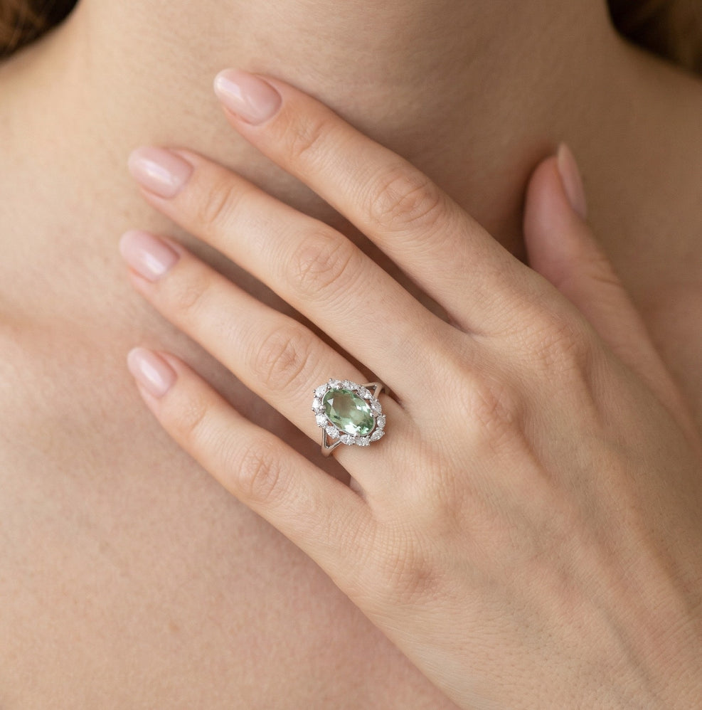 Anillo halo de plata con amatista verde y circonitas cúbicas