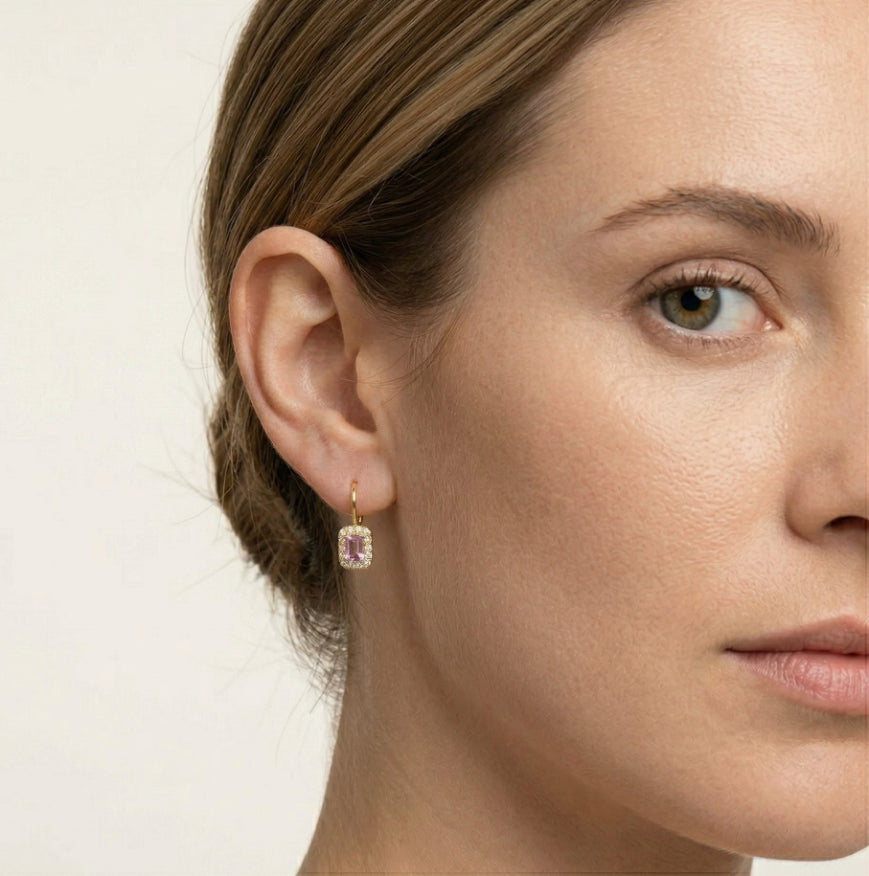 Pendientes colgantes de oro amarillo de 14K combinados con amatista morada de corte esmeralda y un halo de circonitas cúbicas.