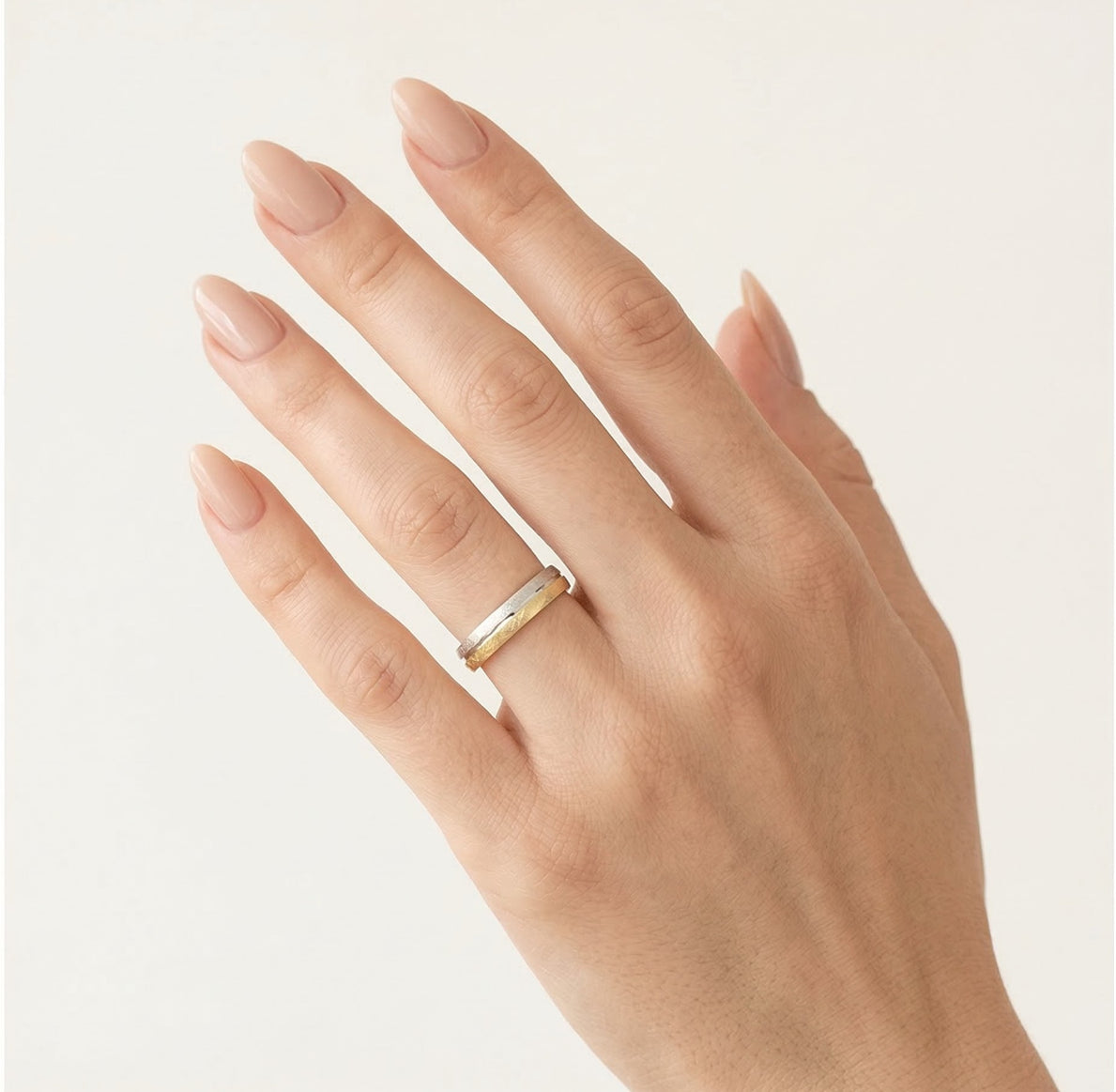 Este anillo de boda de 14kt está diseñado tanto para mujeres como para hombres, con una combinación estilosa de mitad de oro blanco y mitad de oro amarillo. Con una banda de 4 mm y un acabado arenado, este anillo ofrece un aspecto moderno y sofisticado. Elaborado sin piedras, es perfecto para quienes aprecian la joyería minimalista y elegante.