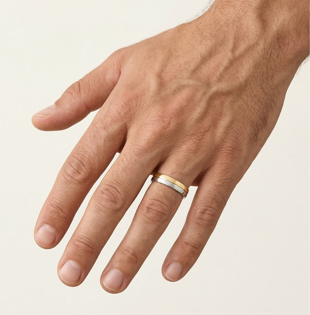 Este exquisito anillo de boda de 14 quilates para mujer y hombre presenta un diseño único mitad oro blanco y mitad oro amarillo con un grosor de 4 mm. Disponible liso o adornado con una zirconia cúbica o diamante de 0,23 ct en talla redonda de corte fino en engaste en canal. Una combinación perfecta de elegancia clásica y estilo moderno, ideal para cualquier pareja.