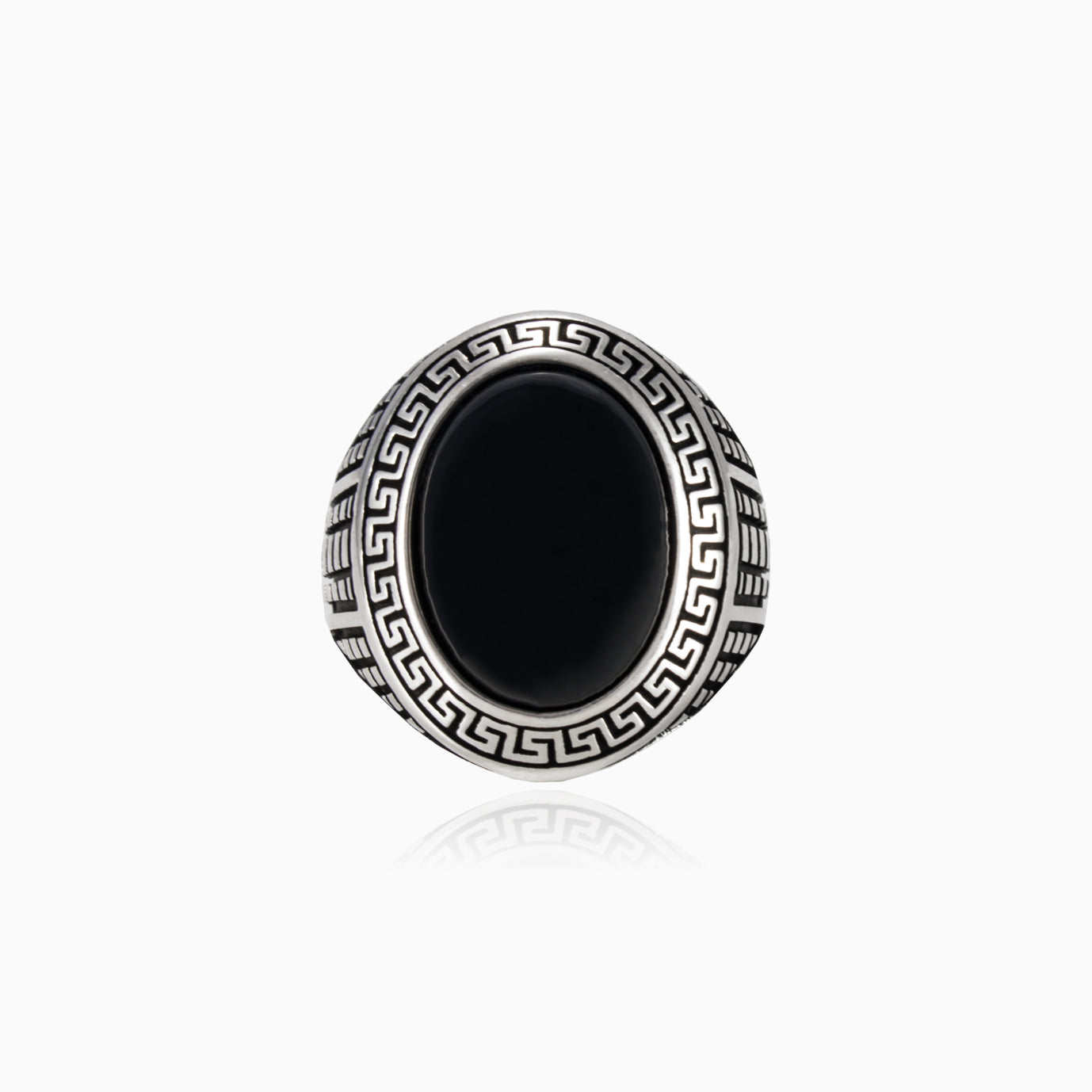 A sterling silver men ring featuring an oval cut onyx in a smooth bezel setting, highlighted by a bold greek pattern that frames the centerpiece with classic strength. The clean design focuses on the deep onyx stone while the patterned band adds distinction and timeless character.