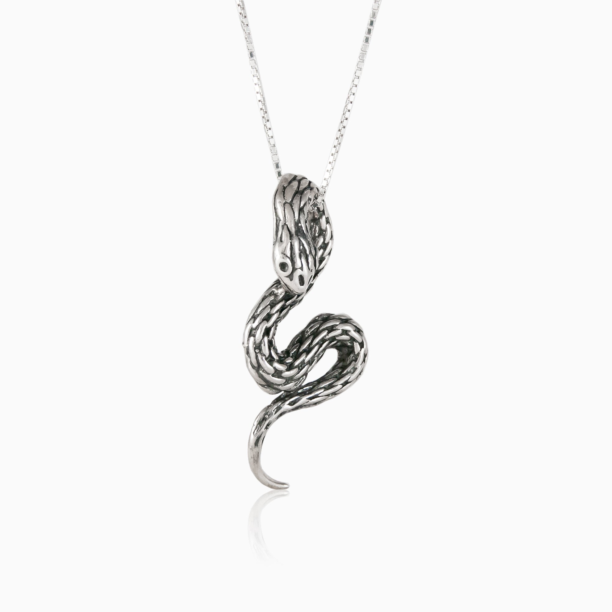 This striking pendant embodies mystery and elegance. Crafted from sterling silver it features a gracefully curved snake design that symbolizes transformation and power. A captivating accessory that adds a bold yet refined touch to any look.