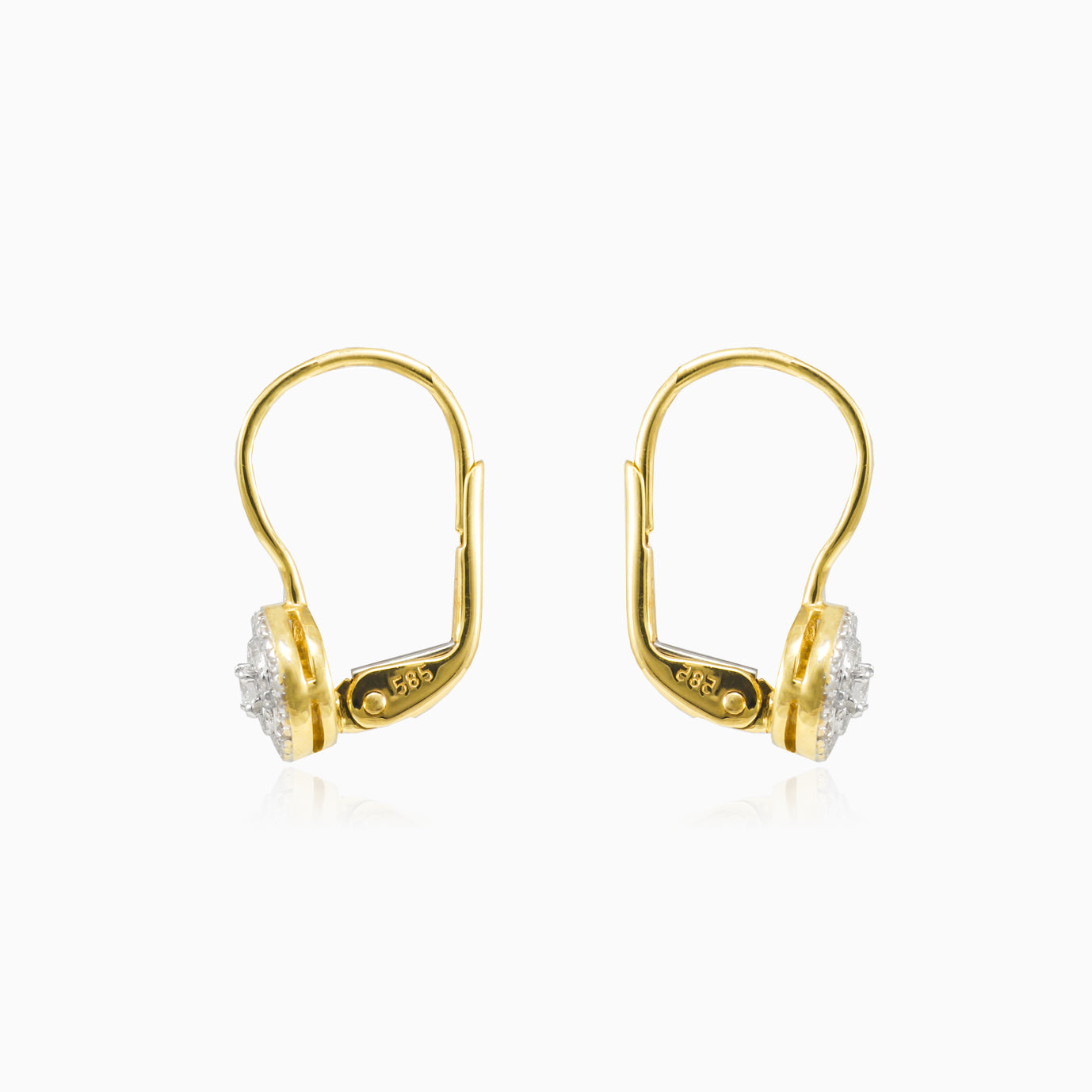 These luminous earrings radiate timeless grace. Handcrafted in 14kt yellow gold with round diamonds set in a delicate pave design, they shimmer with every movement. Finished with a secure lever back closure, they bring a touch of effortless luxury to any occasion.