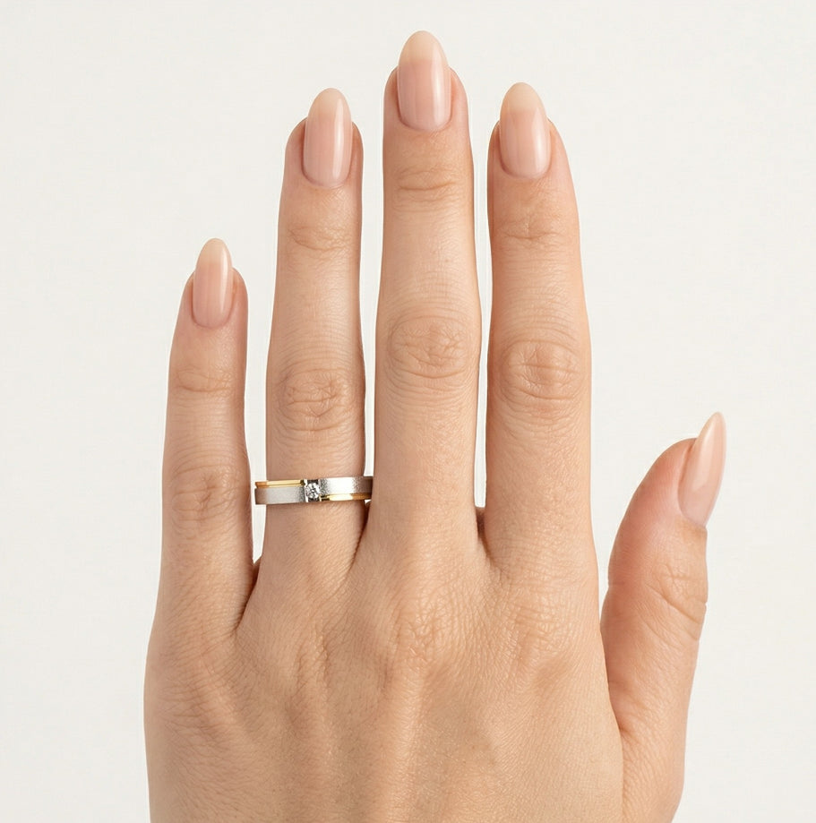 Anillo de boda elegante en oro blanco mate y oro amarillo pulido