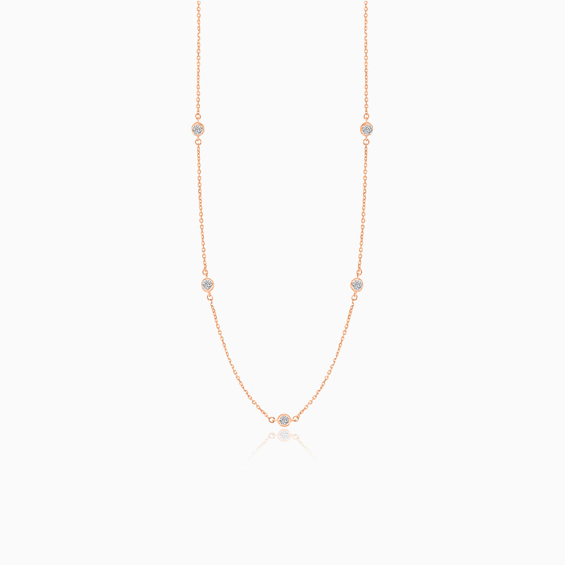 This elegant necklace combines luxury and refinement. Crafted from 18kt rose gold it features a round diamond VS2 G 0.25ct set in a secure bezel that showcases its brilliance. The balanced design and meticulous craftsmanship make it perfect for celebrating milestones expressing love or adding a touch of sophistication to any ensemble. A timeless piece that exudes confidence elegance and lasting beauty.