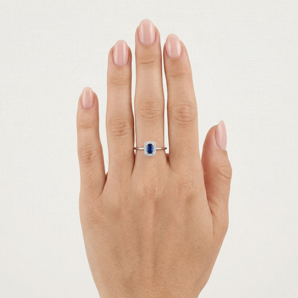 Cette bague pour femmes en or blanc 14 carats présente un saphir synthétique taille radiant rectangulaire, encadré de zircones cubiques rondes taillées. Son sertissage à griffes et son design royal lui confèrent une élégance luxueuse et intemporelle, parfaite pour un port formel ou quotidien.