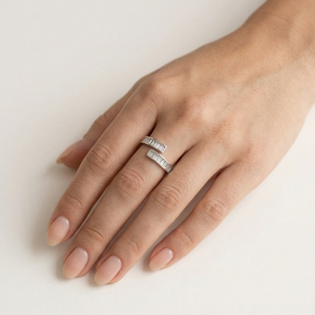 Cette bague pour femme en argent sterling présente un design unique non fini, sublimé par des zirconias cubiques étincelants en coupe baguette. Les pierres sont solidement maintenues dans un sertissage canal épuré, offrant un look moderne et élégant. Parfaite pour ajouter une touche contemporaine à votre collection de bijoux.