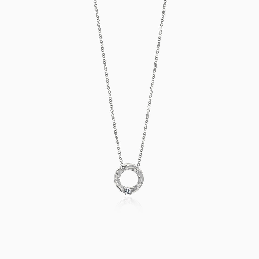 This elegant white gold necklace embodies refined luxury and timeless charm. Crafted in 14kt white gold it features a single round diamond SI1 H 0.03ct beautifully held in a classic four prong setting. The minimalist design allows the diamond to shine with pure brilliance making it perfect for both everyday elegance and special occasions.