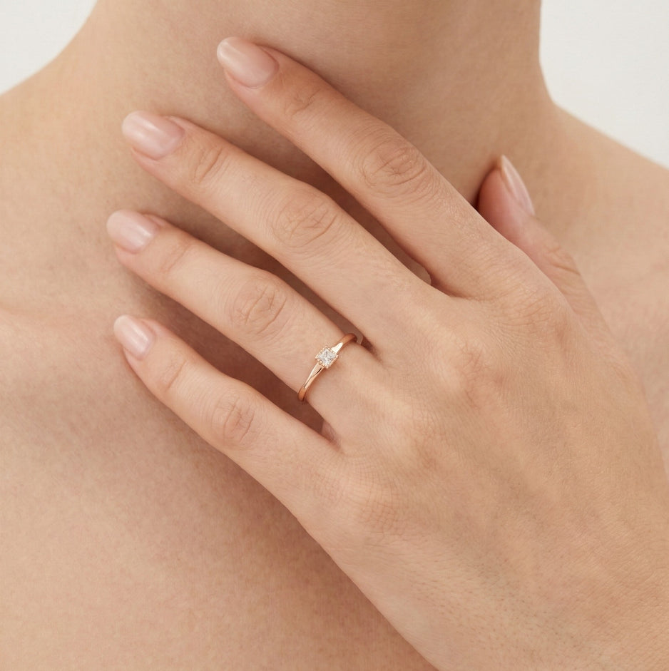 Tento jemný prsten má tenký prstenec vyrobený z 14kt růžového zlata s vysokým leskem a zdobený je jedním zirkonem, který má princess výbrus.